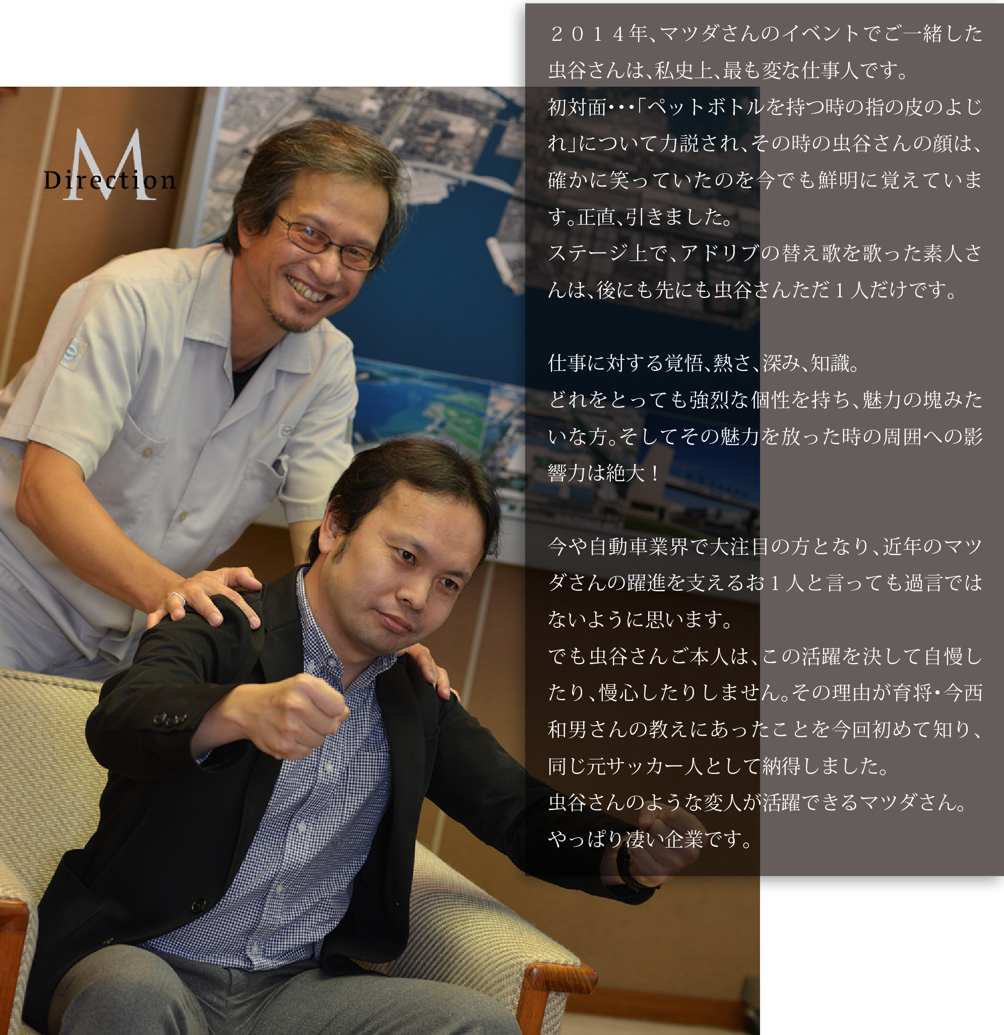 その時、心に決めたことが・・・ “35歳の時に胸を張って、マツダのエンジニアだ”と言えるようになろう。 サッカー選手が30歳を過ぎて引退を考え出し、第2の人生を始める頃の35歳に、私は胸を張っていたいと思いました。でも実は辛かったですよ~ 自分は1人前に仕事ができない、お金もない。でも同級生のJリーガーは、年収ウン千万で、ポルシェに乗って帰省してくるんですからね。やっぱり悔しかったですね。 |