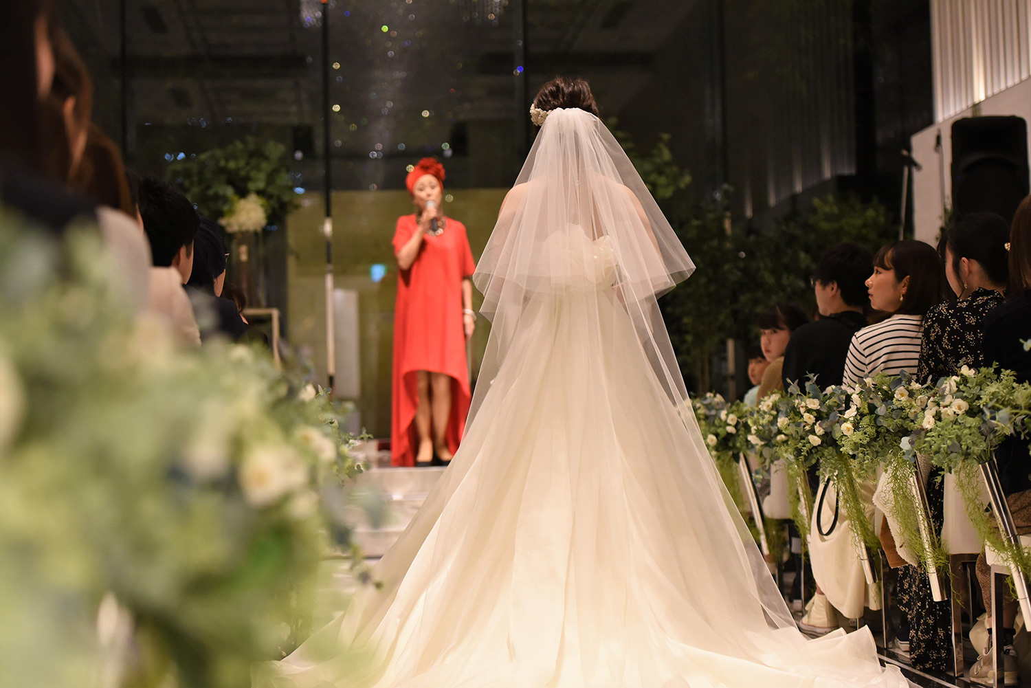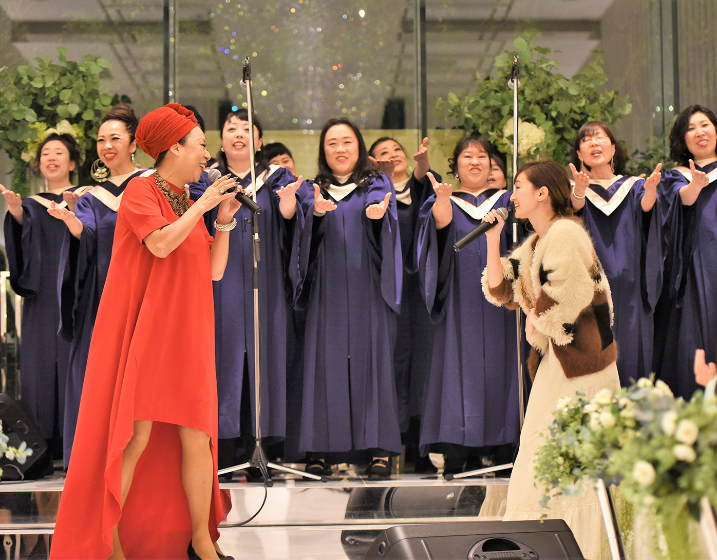 2人目の出演者・TAEKO(たえこ)さんが『Amazing Grace』を歌いながら登場すると、会場の空気が一変。圧倒的な歌唱で、参加者の心を鷲掴みに。そしてウエディングドレスの登場で、さらに神秘的なシーンが続く。