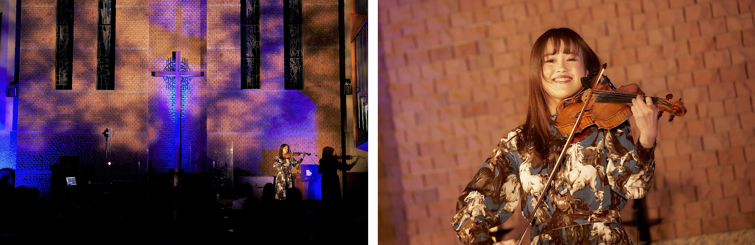 静寂の中、ヴァイオリニスト・大島 理紗子(おおしま りさこ)さんの祈りを込めた『Amazing Grace』で、幕開けしたこの日。この1曲で、礼拝堂内の高揚感は一気に高まり、あの日に想いを馳せる時間に導かれました。